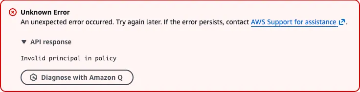 Back in 2016, a younger prettier version of me discovered a cool quirk in the AWS policy validation engine, that is present to this day. If you pass an invalid principal to a resource or trust policy, the policy validation engine will throw an error and tell you it doesn’t exist like so: