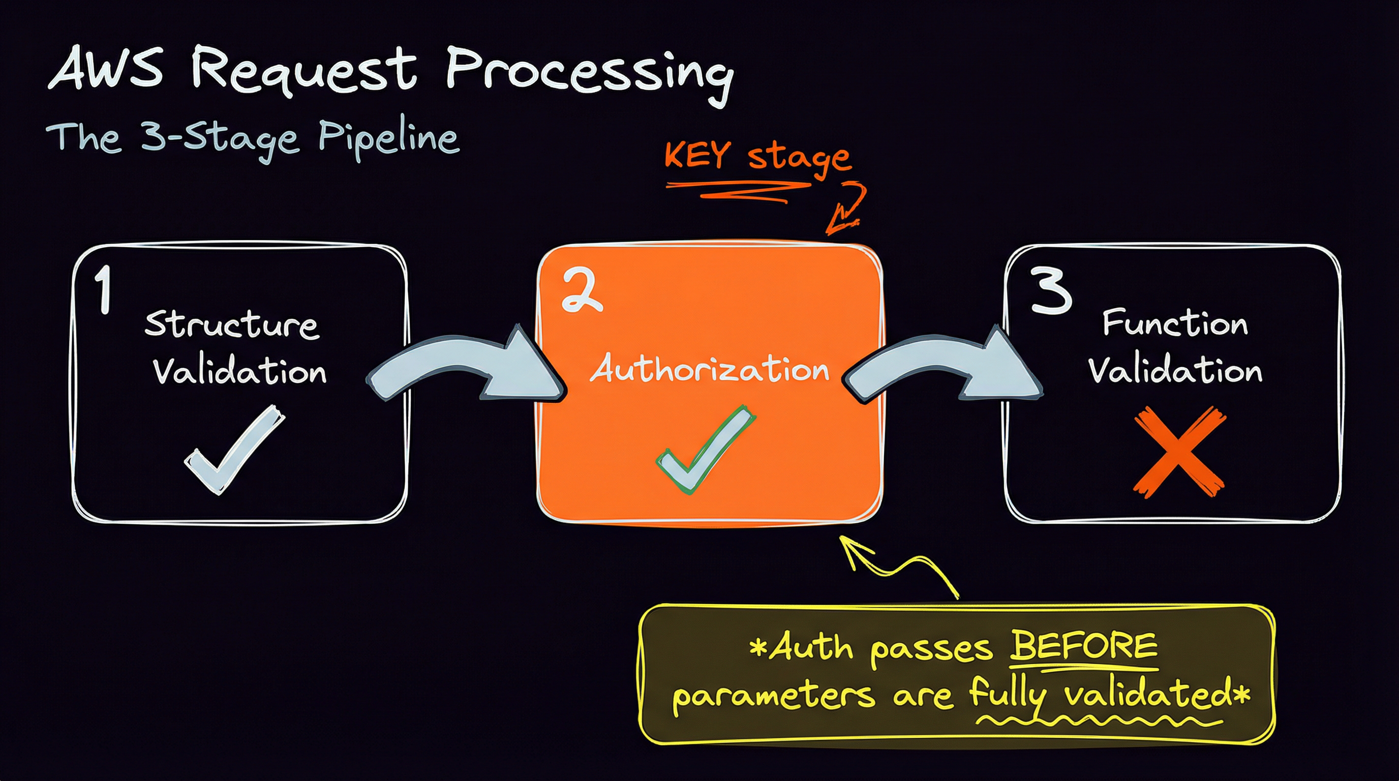 This means you can craft requests that pass structure validation, pass authorization, and then fail on function-specific validation. AWS tells you “yes, you’re authorized” and then “but your request is malformed.”