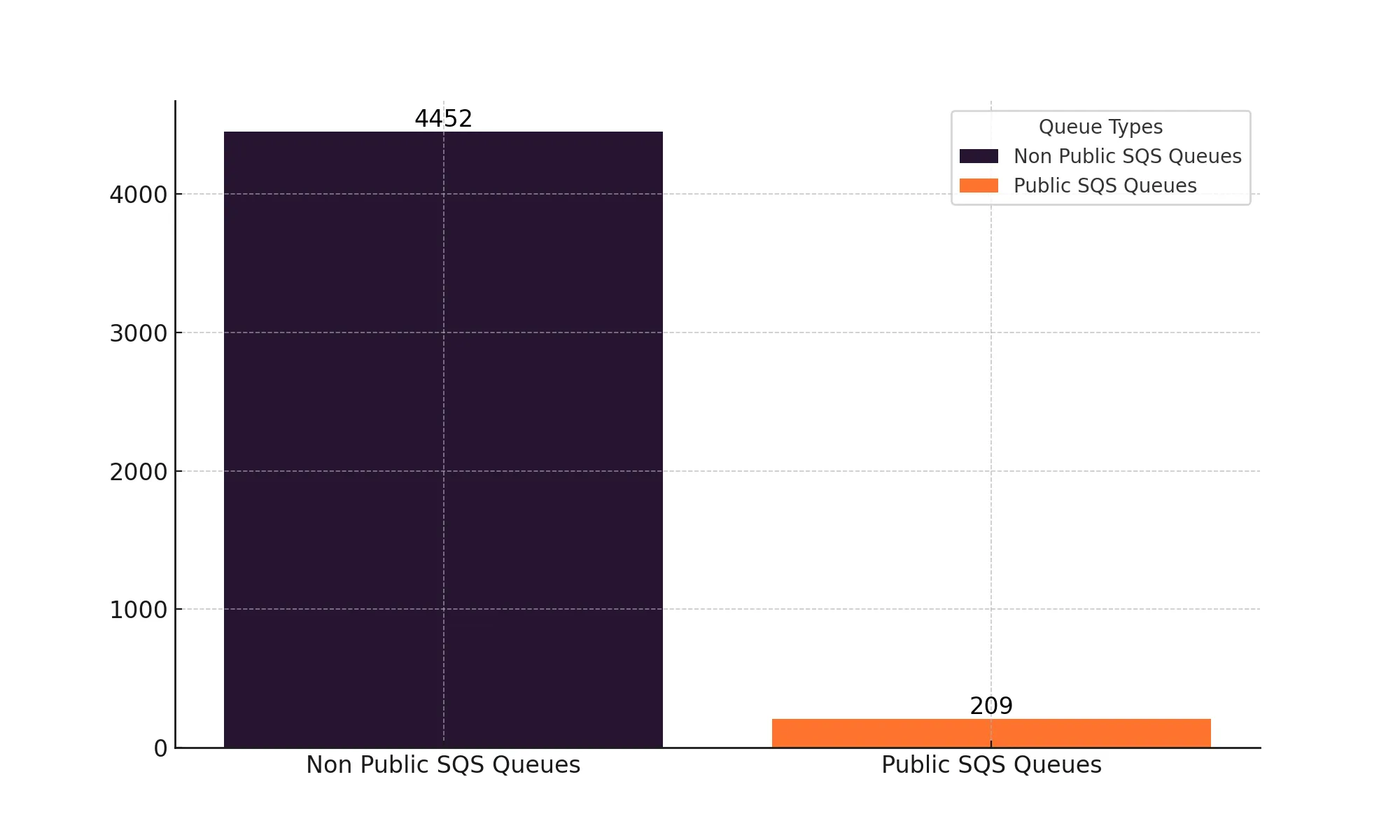 The results of the research revealed 4,452 non-public queues and 209 publicly accessible SQS queues, as shown in the image below.
