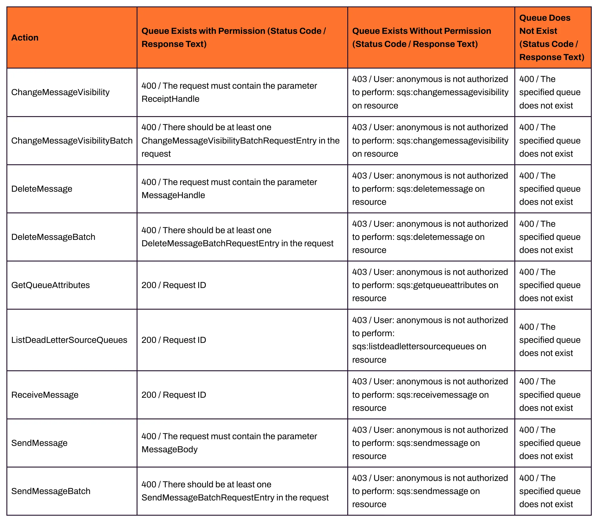 To my great surprise I discovered that making an SQS API request without any parameters often resulted in a response that allowed me to determine if I had permissions to perform the operation or not. I didn’t need to read, write, or perform any actions on the queues to determine if a queue is publicly accessible.